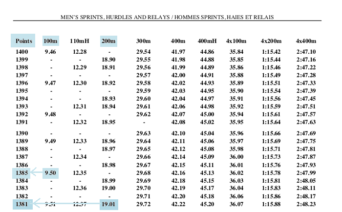 If someone runs the men's 100 metres in 9.50 seconds, that is awarded 1385 points by the table while if someone else runs the men's 200 metres in 19.01 seconds, they are given 1381 points. So the men's 100 metres in 9.50 seconds is considered a superior performance to running the men's 200 metres in 19.01 seconds.